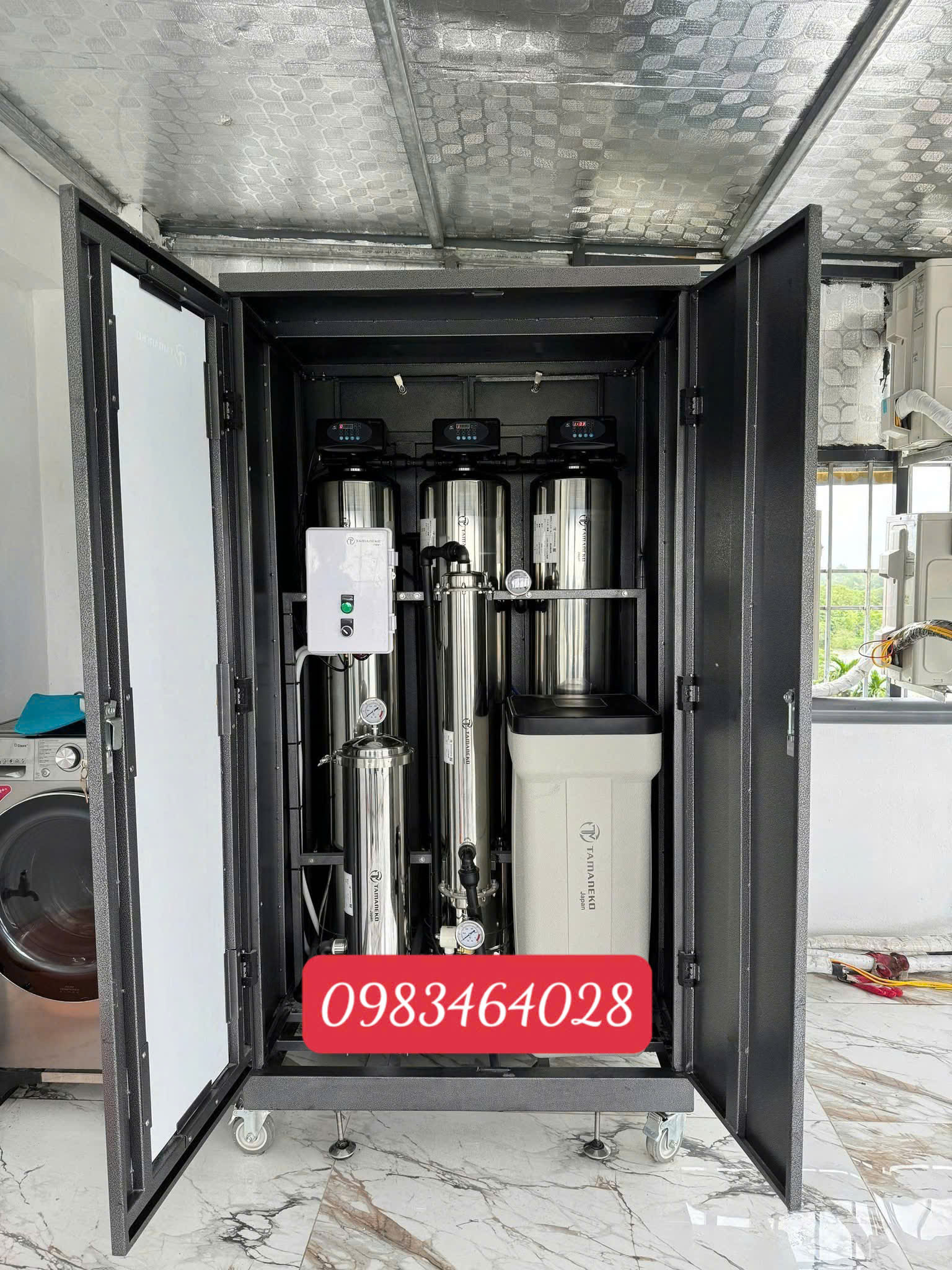 Bộ lọc tổng đầu nguồn cao cấp có tủ che, lọc sạch phèn, clo, kim loại nặng, bảo vệ toàn bộ nguồn nước sinh hoạt gia đình.